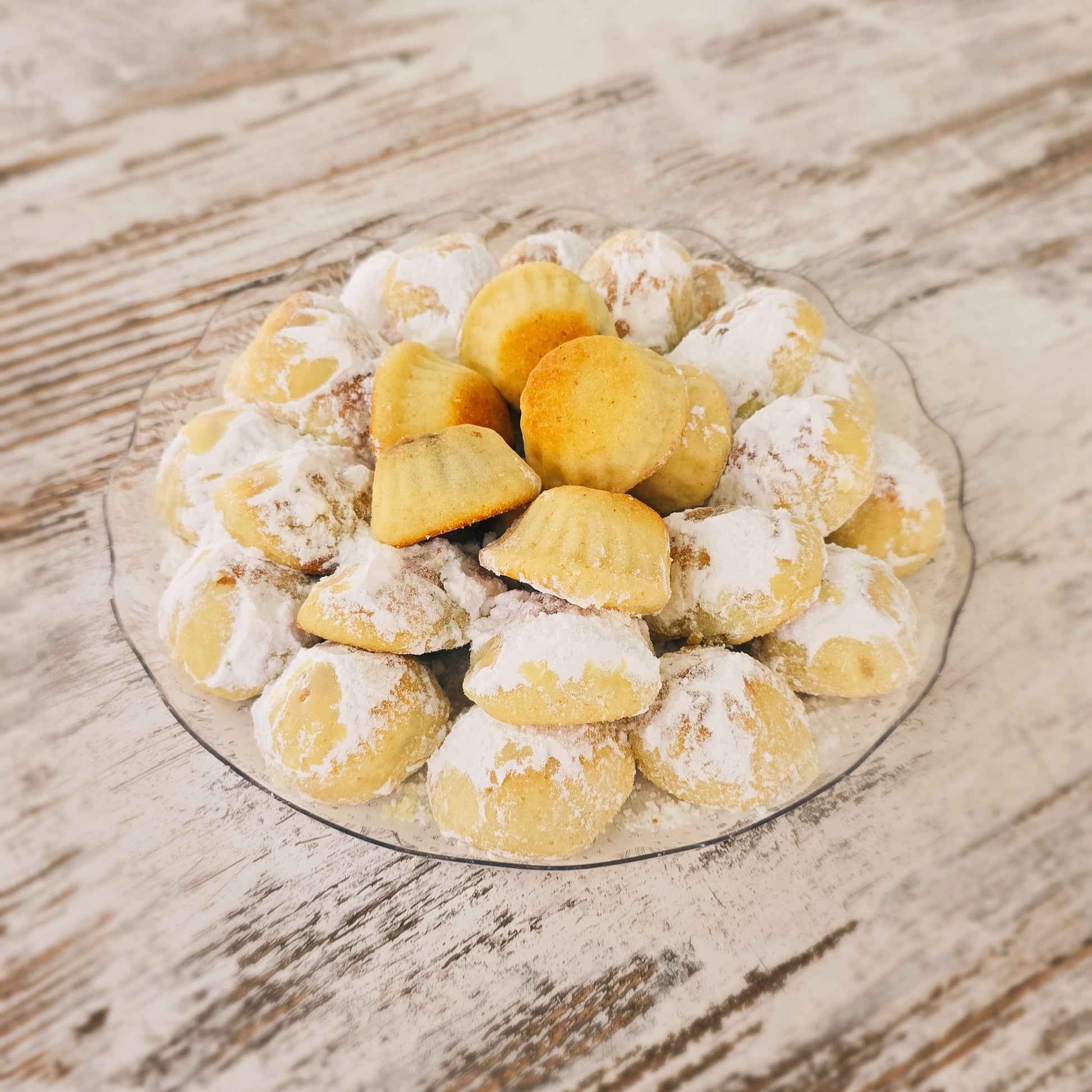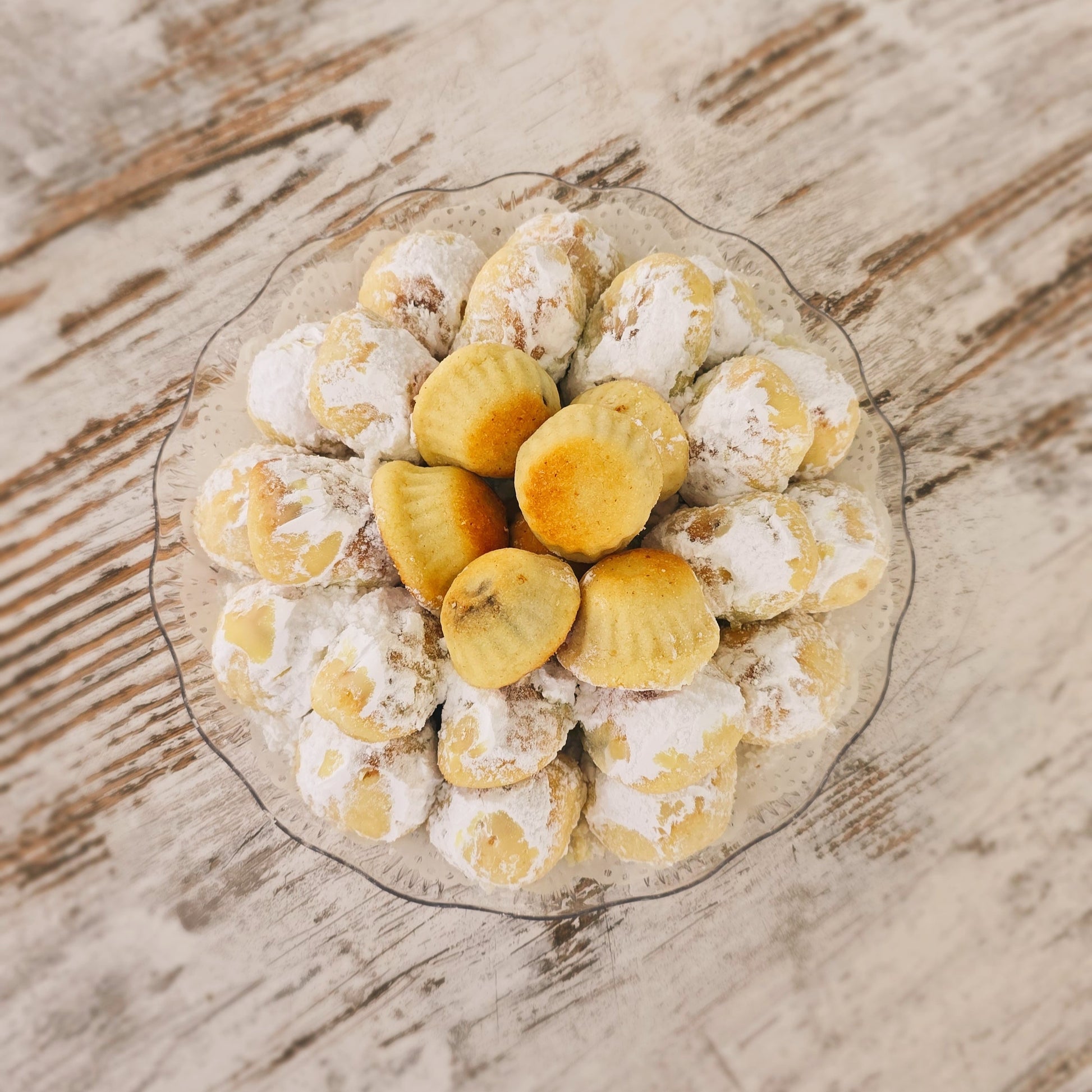 Mini shortbread butter cookies made with semolina flour. Stuffed with dates, pistachio or walnuts.