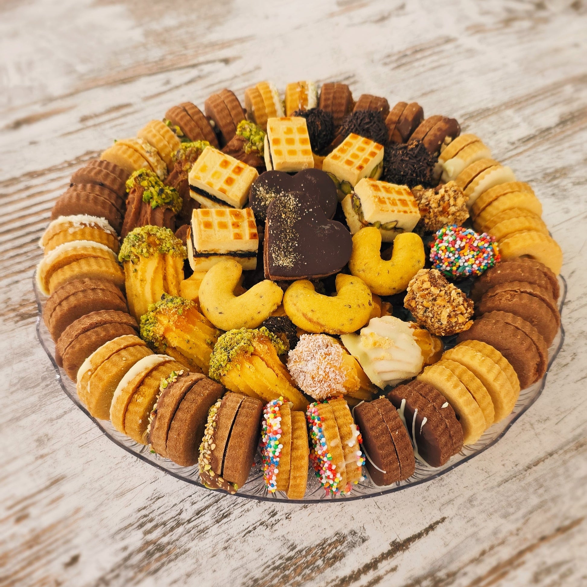 Please note that the biscuits will vary depending on product availability and the photographs are of a 1kg and 1.5kg tray for visual reference.