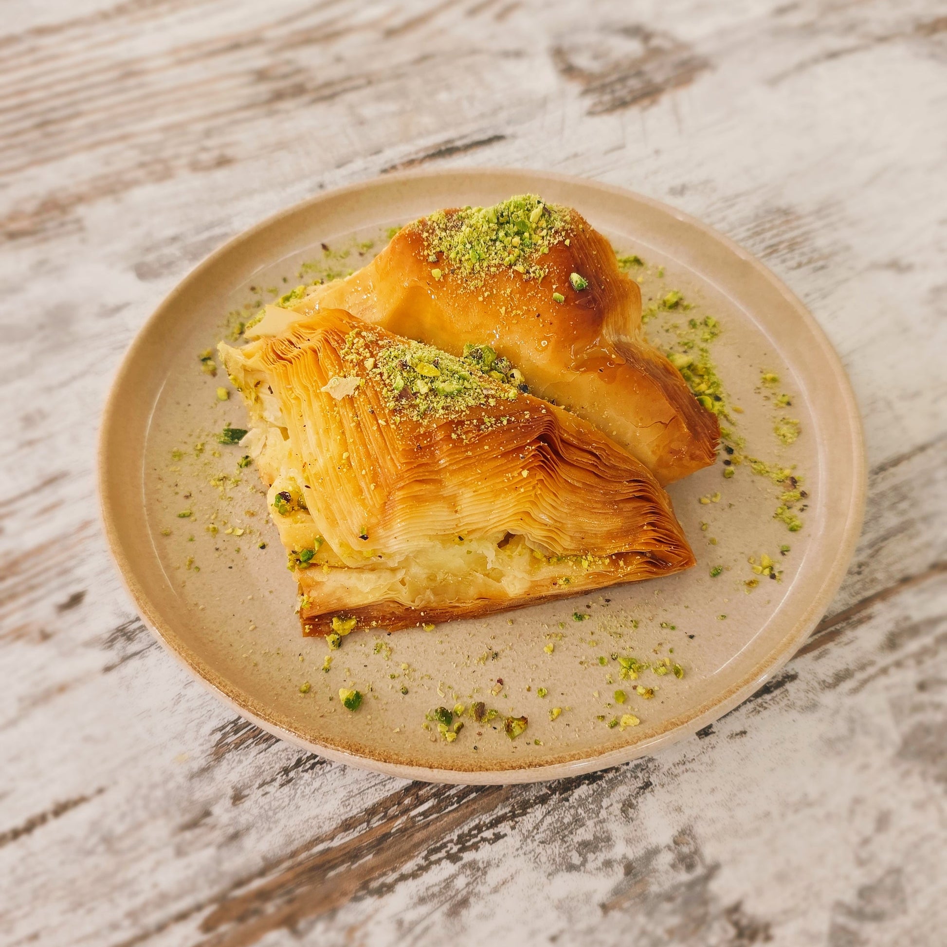 Filo pastry layered with butter, filled with a soft semolina cream, wrapped & baked until golden brown. Drizzled with orange blossom infused syrup.