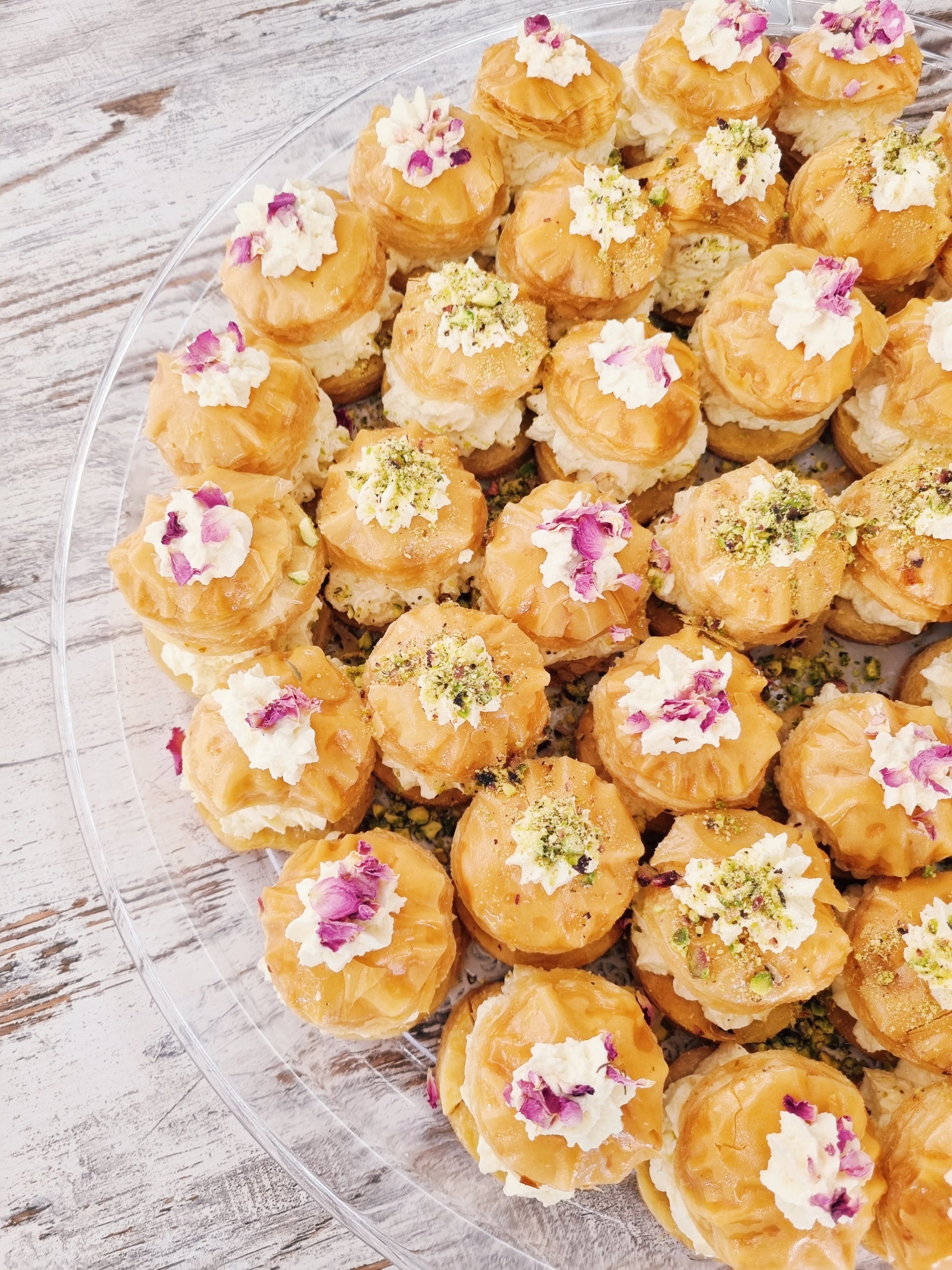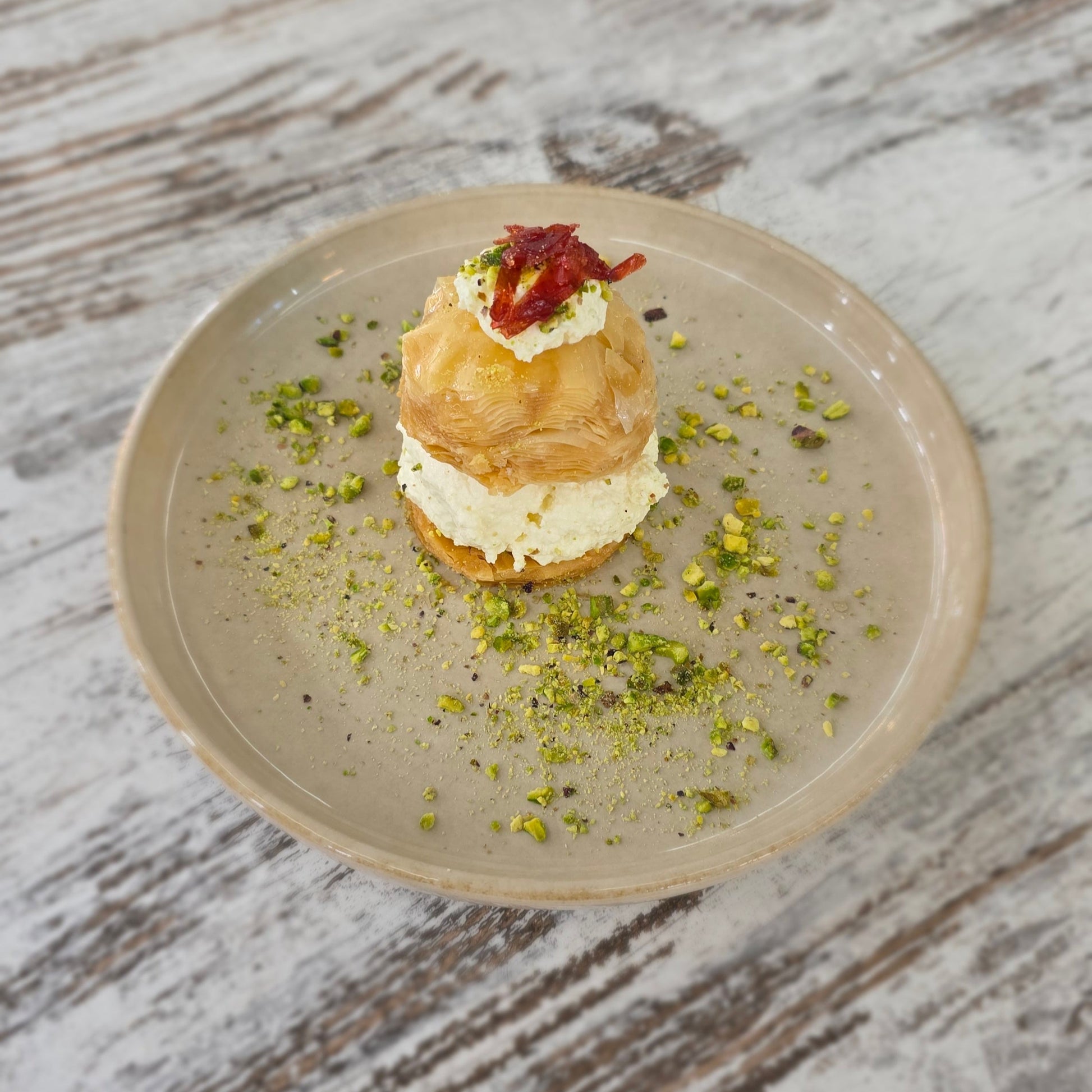 Filo pastry filled with fresh Lebanese ashta, topped with pistachios and rose petal jam.